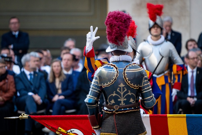 27 cadets of the Pontifical Swiss Guard pronounce the swearing-in oath in the St. Damasus Courtyard in Vatican City, Vatican, on 04 October 2025.