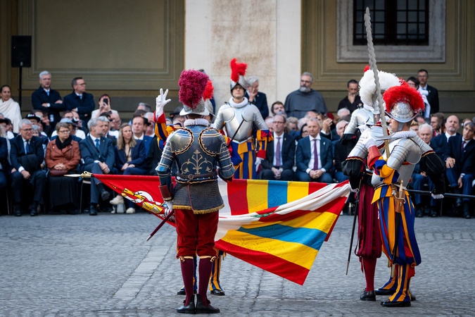 27 kadetów Papieskiej Gwardii Szwajcarskiej składa przysięgę na dziedzińcu św. Damazego w Watykanie, 4 października 2025 r.