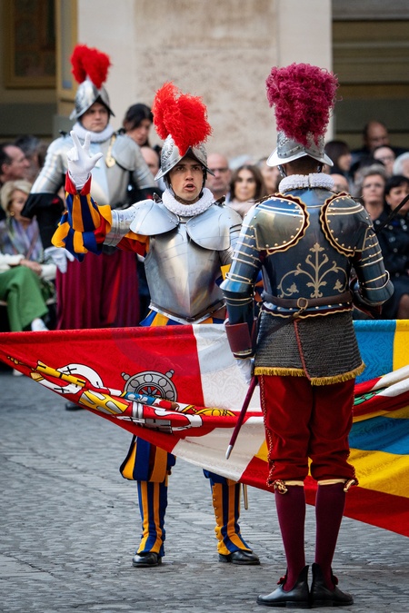 27 kadetów Papieskiej Gwardii Szwajcarskiej składa przysięgę na dziedzińcu św. Damazego w Watykanie, 4 października 2025 r.