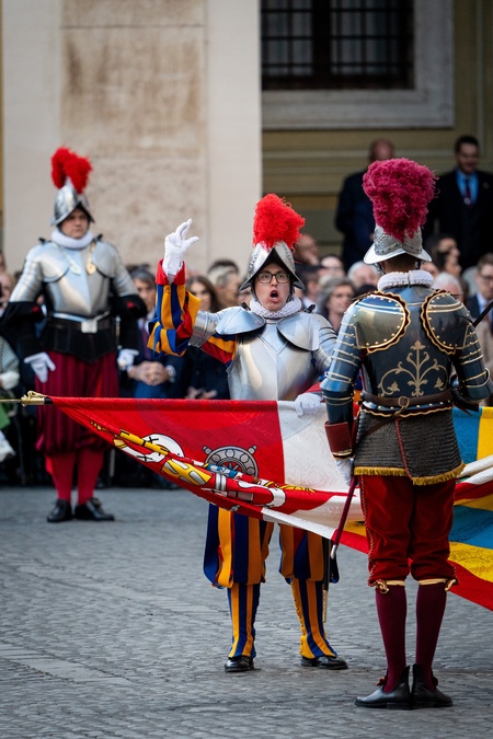 27 kadetów Papieskiej Gwardii Szwajcarskiej składa przysięgę na dziedzińcu św. Damazego w Watykanie, 4 października 2025 r.