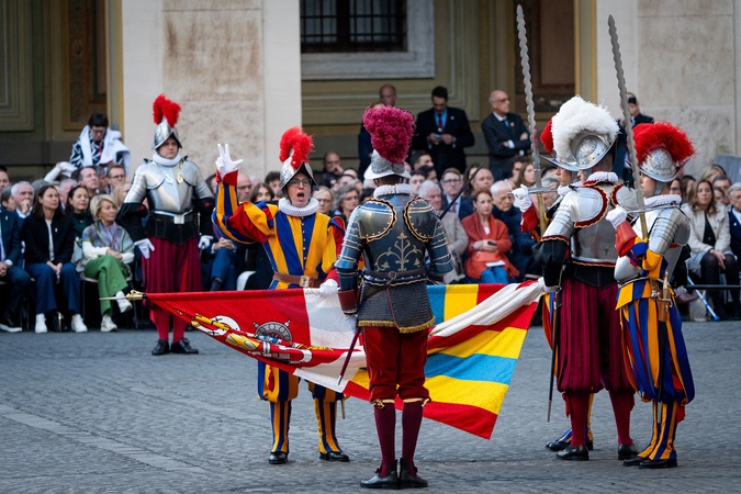 27 kadetów Papieskiej Gwardii Szwajcarskiej składa przysięgę na dziedzińcu św. Damazego w Watykanie, 4 października 2025 r.