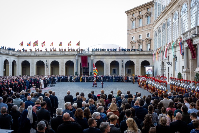 27 cadets of the Pontifical Swiss Guard pronounce the swearing-in oath in the St. Damasus Courtyard in Vatican City, Vatican, on 04 October 2025.