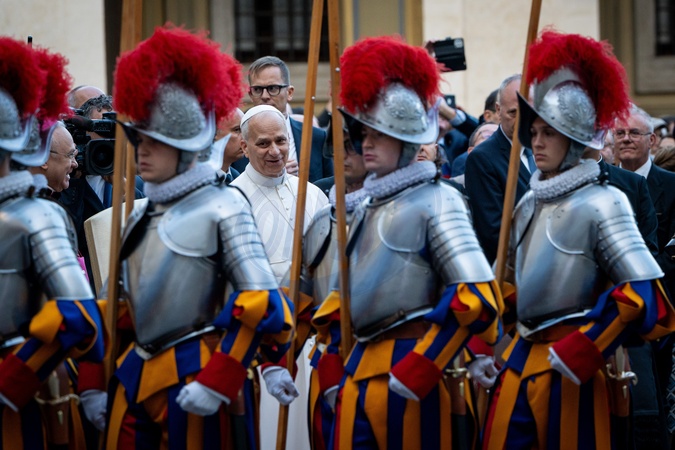27 cadets of the Pontifical Swiss Guard pronounce the swearing-in oath in the St. Damasus Courtyard in Vatican City, Vatican, on 04 October 2025., Credit:Stefano Costantino TTL / Avalon