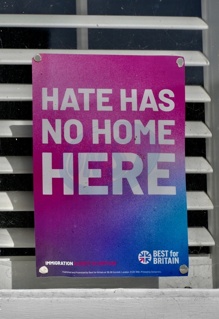 A home in the Oxfordshire market town displays a sign saying hate has no home here, by best for Britain, Credit:Geoffrey Swaine / Avalon