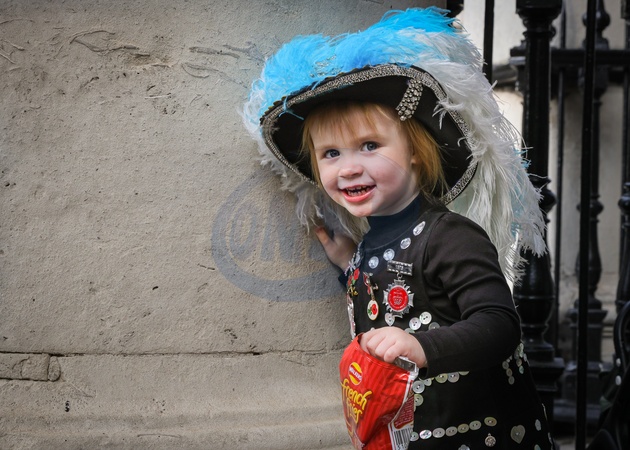 London, UK, 05th Oct 2025. Pearly Princess Phoebe in her feather hat. Phoebe and Olive, both 2 and 'Pearly Princesses', are the youngest members to participate. The Original Pearly Kings and Queens Association celebrate their annual Harvest Festival at St Martin-in-the-Fields church. The association originated in 1875. The Pearly Kings and Queens give their time for free to raise funds for nominated charities to provide to others a better way of living and to support those who are in need of help., Credit:Imageplotter / Avalon