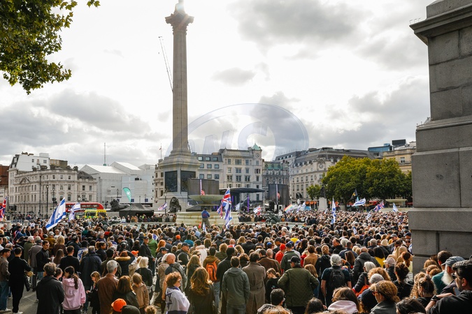 London, UK, 05th Oct 2025. A commemorative event is held on Trafalgar Square in London ahead of Tuesday's anniversary of the October 7 attacks in Israel, to honour the lives lost and call for the release of all hostages. The event is organised by the Board of Deputies of British Jews (BDBJ), in cooperation with the Jewish Leadership Council and other organisations., Credit:Imageplotter / Avalon