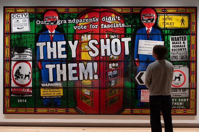 A staff member views 'They Shot Them' (2014) as part of The '21st Century Pictures' exhibition by Gilbert & George at Hayward Gallery, London, England, UK on Monday 6 October, 2025 which runs from Tue 7 October 2025 to Sun 11 January 2026., Credit:Justin Ng / Avalon