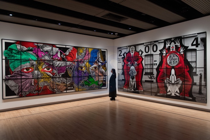 A staff member views (L) - 'Chain Brain' (2014) and (R) 'Hooligans' (2004) as part of The '21st Century Pictures' exhibition by Gilbert & George at Hayward Gallery, London, England, UK on Monday 6 October, 2025 which runs from Tue 7 October 2025 to Sun 11 January 2026., Credit:Justin Ng / Avalon