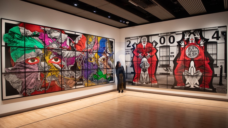 A staff member views (L) - 'Chain Brain' (2014) and (R) 'Hooligans' (2004) as part of The '21st Century Pictures' exhibition by Gilbert & George at Hayward Gallery, London, England, UK on Monday 6 October, 2025 which runs from Tue 7 October 2025 to Sun 11 January 2026., Credit:Justin Ng / Avalon