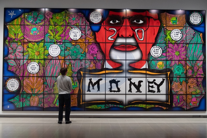 Gilbert Prousch and George Passmore pose with their artwork 'Sex Money Race Religion' (2005) as part of The '21st Century Pictures' exhibition by Gilbert & George at Hayward Gallery, London, England, UK on Monday 6 October, 2025 which runs from Tue 7 October 2025 to Sun 11 January 2026., Credit:Justin Ng / Avalon