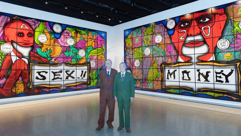 Gilbert Prousch and George Passmore pose with their artwork 'Sex Money Race Religion' (2005) as part of The '21st Century Pictures' exhibition by Gilbert & George at Hayward Gallery, London, England, UK on Monday 6 October, 2025 which runs from Tue 7 October 2025 to Sun 11 January 2026., Credit:Justin Ng / Avalon