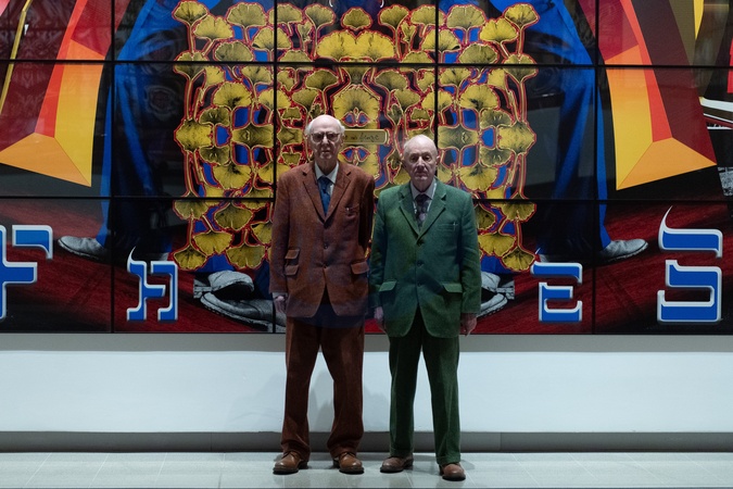 Gilbert Prousch and George Passmore pose with their artwork 'Fates' (2005) as part of The '21st Century Pictures' exhibition by Gilbert & George at Hayward Gallery, London, England, UK on Monday 6 October, 2025 which runs from Tue 7 October 2025 to Sun 11 January 2026., Credit:Justin Ng / Avalon