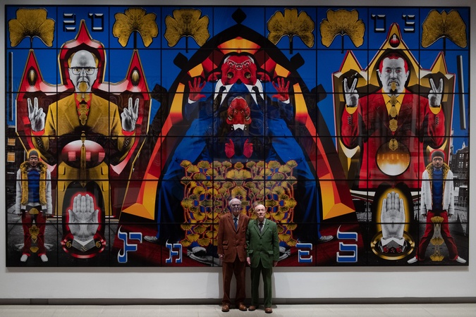 Gilbert Prousch and George Passmore pose with their artwork 'Fates' (2005) as part of The '21st Century Pictures' exhibition by Gilbert & George at Hayward Gallery, London, England, UK on Monday 6 October, 2025 which runs from Tue 7 October 2025 to Sun 11 January 2026., Credit:Justin Ng / Avalon
