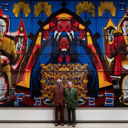 Gilbert Prousch and George Passmore pose with their artwork 'Fates' (2005) as part of The '21st Century Pictures' exhibition by Gilbert & George at Hayward Gallery, London, England, UK on Monday 6 October, 2025 which runs from Tue 7 October 2025 to Sun 11 January 2026., Credit:Justin Ng / Avalon