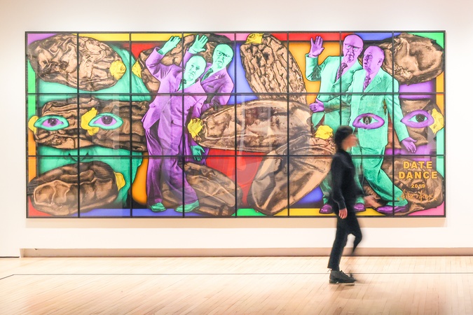 London, UK. 06th Oct 2025. Staff with Gilbert & George, DATE DANCE, 2019. The Hayward Gallery's new exhibition '21ST CENTURY PICTURES' by artists Gilbert & George highlights the artists' evolution over the past 25 years. It presents 60 floor-to-ceiling installations, debuting new pictures alongside acclaimed works, exploring themes of hope, fear, sex, religion, corruption and death., Credit:Imageplotter / Avalon