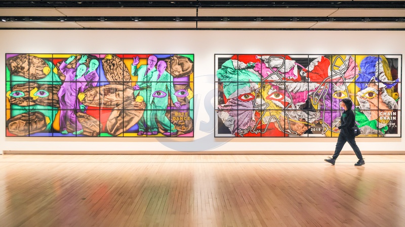 London, UK. 06th Oct 2025. Staff with Gilbert & George, DATE DANCE and CHAIN BREAK, both 2019. The Hayward Gallery's new exhibition '21ST CENTURY PICTURES' by artists Gilbert & George highlights the artists' evolution over the past 25 years. It presents 60 floor-to-ceiling installations, debuting new pictures alongside acclaimed works, exploring themes of hope, fear, sex, religion, corruption and death., Credit:Imageplotter / Avalon