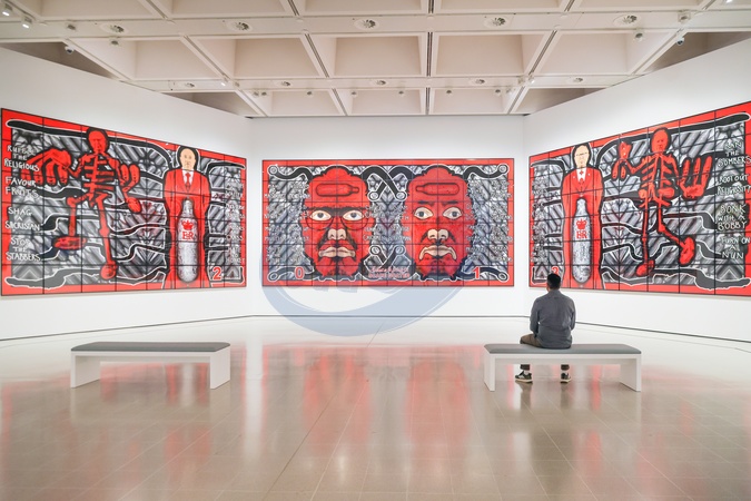 London, UK. 06th Oct 2025. Staff with Gilbert & George, SCAPEGOATED (Triptych), 2013. The Hayward Gallery's new exhibition '21ST CENTURY PICTURES' by artists Gilbert & George highlights the artists' evolution over the past 25 years. It presents 60 floor-to-ceiling installations, debuting new pictures alongside acclaimed works, exploring themes of hope, fear, sex, religion, corruption and death., Credit:Imageplotter / Avalon