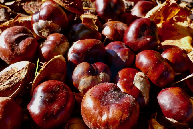 Piles on conkers fallen from the horse chestnut tree in the autumn sunshine., Credit:Geoffrey Swaine / Avalon
