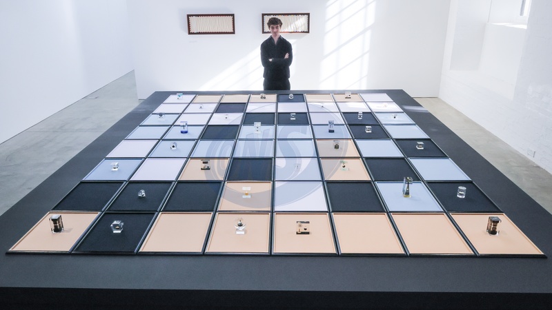 London, UK. 06th Oct 2025. ICA Staff with Tanoa Sasraku, 'Watchlist', 2025, a 32 piece installation of acrylic paperweights encasing crude oil, frequently given out by oil companies as commemorative gifts, and arranged here in a chess board like pattern. The ICA presents ‘Morale Patch', a solo exhibition of new work by Tanoa Sasraku. Through works on paper, found objects and sculpture, Sasraku examines the seductive and destructive power of oil, and its ties to war and national identity., Credit:Imageplotter / Avalon