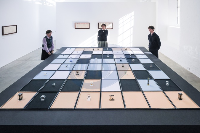 London, UK. 06th Oct 2025. ICA Staff with Tanoa Sasraku, 'Watchlist', 2025, a 32 piece installation of acrylic paperweights encasing crude oil, frequently given out by oil companies as commemorative gifts, and arranged here in a chess board like pattern. The ICA presents ‘Morale Patch', a solo exhibition of new work by Tanoa Sasraku. Through works on paper, found objects and sculpture, Sasraku examines the seductive and destructive power of oil, and its ties to war and national identity., Credit:Imageplotter / Avalon