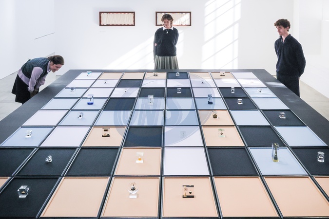 London, UK. 06th Oct 2025. ICA Staff with Tanoa Sasraku, 'Watchlist', 2025, a 32 piece installation of acrylic paperweights encasing crude oil, frequently given out by oil companies as commemorative gifts, and arranged here in a chess board like pattern. The ICA presents ‘Morale Patch', a solo exhibition of new work by Tanoa Sasraku. Through works on paper, found objects and sculpture, Sasraku examines the seductive and destructive power of oil, and its ties to war and national identity., Credit:Imageplotter / Avalon