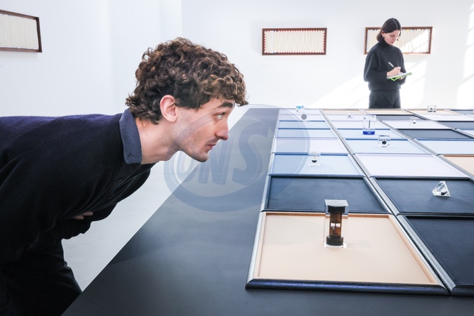 London, UK. 06th Oct 2025. ICA Staff with Tanoa Sasraku, 'Watchlist', 2025, a 32 piece installation of acrylic paperweights encasing crude oil, frequently given out by oil companies as commemorative gifts, and arranged here in a chess board like pattern. The ICA presents ‘Morale Patch', a solo exhibition of new work by Tanoa Sasraku. Through works on paper, found objects and sculpture, Sasraku examines the seductive and destructive power of oil, and its ties to war and national identity., Credit:Imageplotter / Avalon