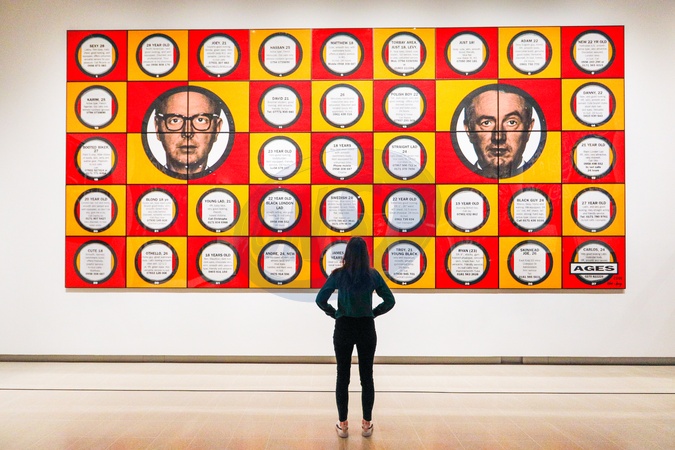 London, UK. 06th Oct 2025. Staff with Gilbert & George, AGES, 2008. The Hayward Gallery's new exhibition '21ST CENTURY PICTURES' by artists Gilbert & George highlights the artists' evolution over the past 25 years. It presents 60 floor-to-ceiling installations, debuting new pictures alongside acclaimed works, exploring themes of hope, fear, sex, religion, corruption and death., Credit:Imageplotter / Avalon