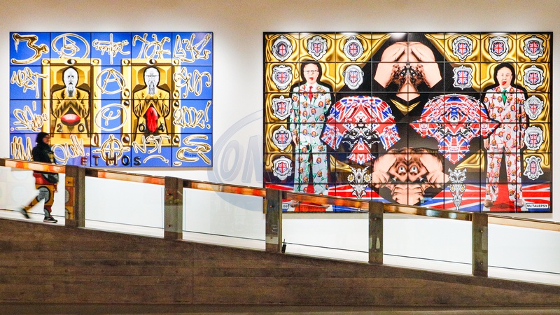 London, UK. 06th Oct 2025. Staff with Gilbert & George, (left to right) ETHOS, 2004 and METALEPSY, 2008. The Hayward Gallery's new exhibition '21ST CENTURY PICTURES' by artists Gilbert & George highlights the artists' evolution over the past 25 years. It presents 60 floor-to-ceiling installations, debuting new pictures alongside acclaimed works, exploring themes of hope, fear, sex, religion, corruption and death., Credit:Imageplotter / Avalon