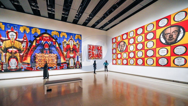 London, UK. 06th Oct 2025. Staff with Gilbert & George, FATES, 2005 (l) and AGES, 2008 (r). The Hayward Gallery's new exhibition '21ST CENTURY PICTURES' by artists Gilbert & George highlights the artists' evolution over the past 25 years. It presents 60 floor-to-ceiling installations, debuting new pictures alongside acclaimed works, exploring themes of hope, fear, sex, religion, corruption and death., Credit:Imageplotter / Avalon