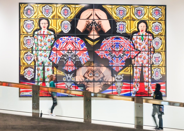 London, UK. 06th Oct 2025. Staff with Gilbert & George, METALEPSY, 2008. The Hayward Gallery's new exhibition '21ST CENTURY PICTURES' by artists Gilbert & George highlights the artists' evolution over the past 25 years. It presents 60 floor-to-ceiling installations, debuting new pictures alongside acclaimed works, exploring themes of hope, fear, sex, religion, corruption and death., Credit:Imageplotter / Avalon