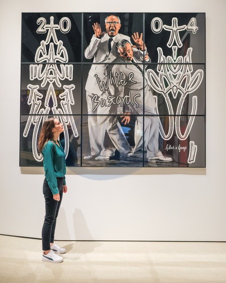 London, UK. 06th Oct 2025. Staff with with Gilbert & George, WHITE BASTARDS, 2004. The Hayward Gallery's new exhibition '21ST CENTURY PICTURES' by artists Gilbert & George highlights the artists' evolution over the past 25 years. It presents 60 floor-to-ceiling installations, debuting new pictures alongside acclaimed works, exploring themes of hope, fear, sex, religion, corruption and death., Credit:Imageplotter / Avalon