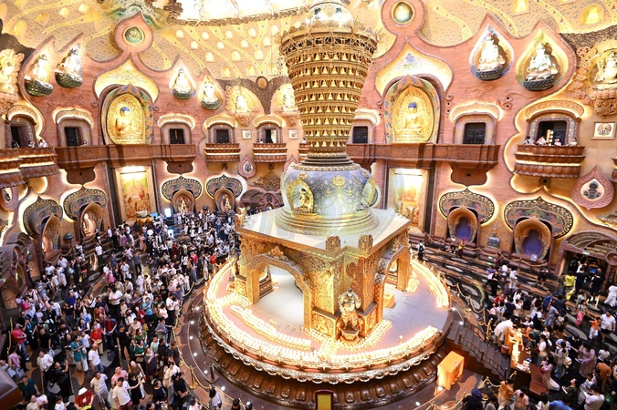 Tourists crowd into a lavishly decorated modern Buddhist attraction in Nanjing in east China's Jiangsu province Monday, Oct. 6, 2025., Credit:HAO QY / Avalon