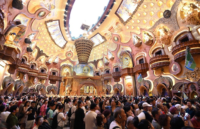 Tourists crowd into a lavishly decorated modern Buddhist attraction in Nanjing in east China's Jiangsu province Monday, Oct. 6, 2025., Credit:HAO QY / Avalon