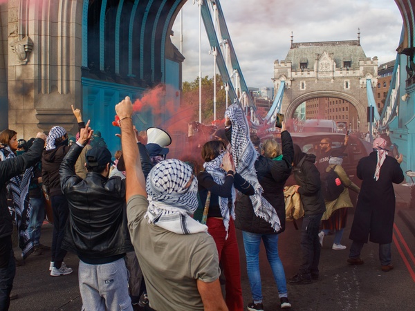 Protesters from Youth Demand and other Palestine groups block Tower Bridge, London, UK, 7 October 2025, Credit:Alex Day / Avalon