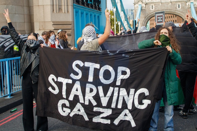 Protesters from Youth Demand and other Palestine groups block Tower Bridge, London, UK, 7 October 2025, Credit:Alex Day / Avalon