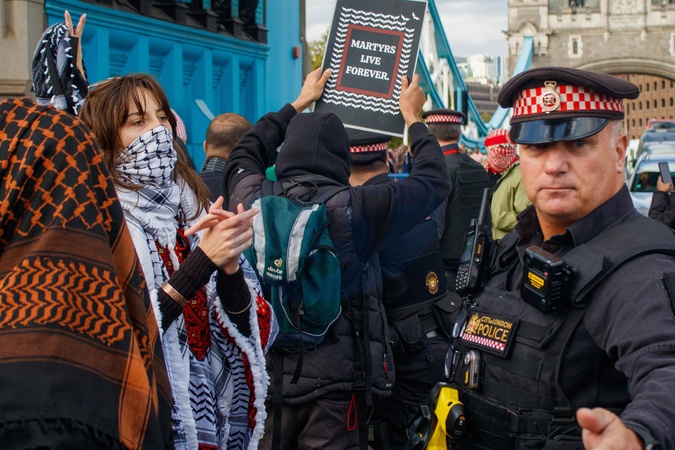 Protesters from Youth Demand and other Palestine groups block Tower Bridge, London, UK, 7 October 2025, Credit:Alex Day / Avalon
