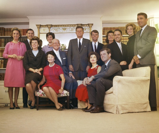 Kennedy Family Portrait. The Kennedy family in the home of Joseph P. Kennedy on Nov. 9, 1960. Standing, left to right: Ethel Skakel Kennedy, Steve Smith, Jean Kennedy Smith; President-elect John F. Kennedy, Robert F. Kennedy, Patricia Lawford, Sargent Shriver, Joan Bennett Kennedy and Peter Lawford. In foreground, left to right: Eunice Kennedy Shriver, Rose Kennedy, Joseph P. Kennedy, Jacqueline Bouvier Kennedy and Edward M. Kennedy. Courtesy JFK Library, Credit:JFK Library / Avalon
