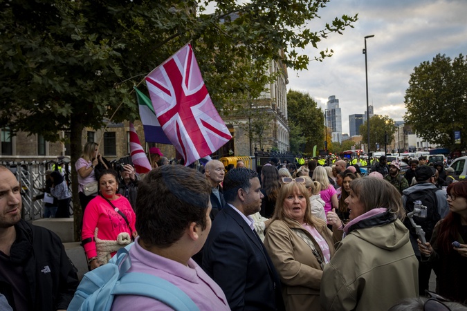 A protest organised by the right-wing group known as the ‘Pink Ladies' took place outside Tower Hamlets Town Hall in East London. The demonstration was met by counter-protesters opposing their message, leading to tense exchanges between both sides. Police maintained a visible presence to keep the groups apart as crowds gathered outside the Town Hall., Credit:Zak Irfan / Avalon