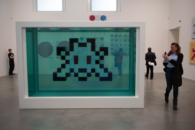 A visitor views 'Secret of The Deep' (2005) by Damien Hirst and Invader at 'Triple Trouble' - an exhibition of new collaborative works by Shepard Fairey, Damien Hirst and Invader at Newport Street Gallery, London, England, UK on Thursday 9 October, 2025., Credit:Justin Ng / Avalon