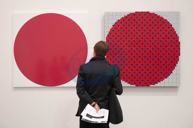 A visitor views 'Rubix 20mg' (2005) by Damien Hirst at 'Triple Trouble' - an exhibition of new collaborative works by Shepard Fairey, Damien Hirst and Invader at Newport Street Gallery, London, England, UK on Thursday 9 October, 2025., Credit:Justin Ng / Avalon