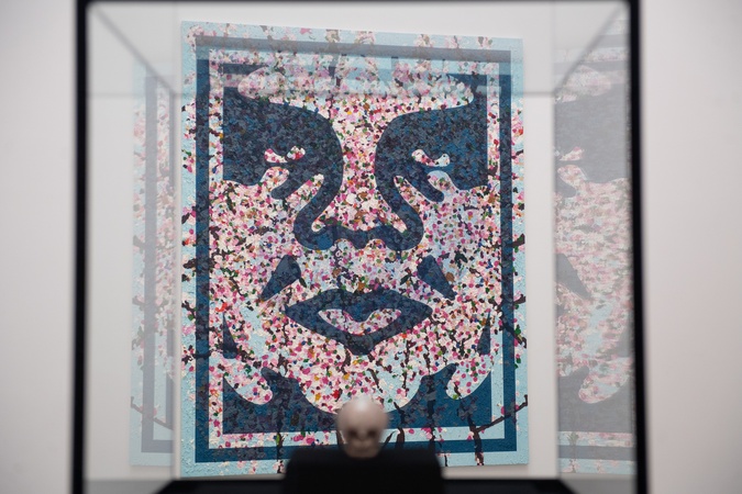 A visitor views (background) - 'Commanded Blossom' (2022) by Damien Hirst and Shepard Fairey and (foreground) - 'For Heaven's Sake' 2008 by Damien Hirst at 'Triple Trouble' - an exhibition of new collaborative works by Shepard Fairey, Damien Hirst and Invader at Newport Street Gallery, London, England, UK on Thursday 9 October, 2025., Credit:Justin Ng / Avalon