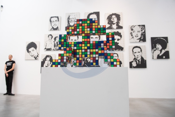 A visitor views 'Big Bronze Rubik Berzerk' (2025) by Invader at 'Triple Trouble' - an exhibition of new collaborative works by Shepard Fairey, Damien Hirst and Invader at Newport Street Gallery, London, England, UK on Thursday 9 October, 2025., Credit:Justin Ng / Avalon
