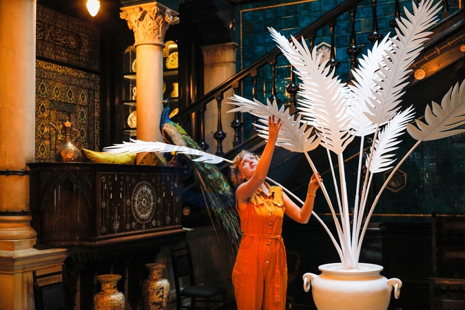 London, UK. 09th Oct 2025. Artist Annemarieke Kloosterhof in the grand staircase with one of four 'Ghost Objects' from Leighton's original collection, in their original place,but intricately handcrafted in white paper, featuring hand-cut details and using techniques like layering, embossing and sculpting - here a palm tree. Leighton House is marking 100 years since the former home of Victorian artist Frederic Leighton first opened to the public as a museum. As part of the celebrations, new life-sized paper artworks by Annemarieke Kloosterhof are also revealed set against the stunning historic interiors., Credit:Imageplotter / Avalon