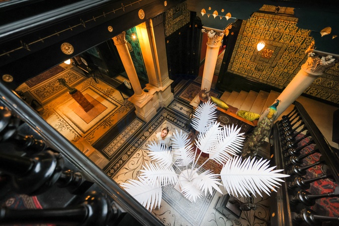 London, UK. 09th Oct 2025. Staff with one of four 'Ghost Objects' from Leighton's original collection, in their original place,but intricately handcrafted in white paper, featuring hand-cut details and using techniques like layering, embossing and sculpting - here a palm tree. Leighton House is marking 100 years since the former home of Victorian artist Frederic Leighton first opened to the public as a museum. As part of the celebrations, new life-sized paper artworks by Annemarieke Kloosterhof are also revealed set against the stunning historic interiors., Credit:Imageplotter / Avalon