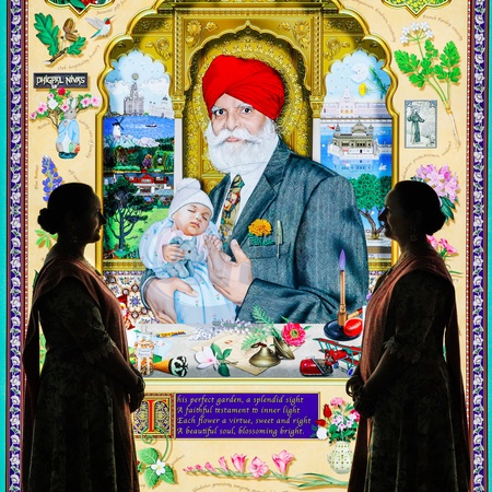 Leondon, UK. 09th Oct 2025. The Singh Twins with their triptych work (l-t-r) 'The Arts of Botany', 'The Perfect Garden', and 'The Science of Botany', all 2025. The center image features their own father. At the Shirley Sherwood Gallery of Botanical Art, Kew Gardens, new exhibitions recover the lost stories of remarkable artworks and illuminate traditional Indian art. New lightbox works from acclaimed artists The Singh Twins are on display to the public for the first time., Credit:Imageplotter / Avalon
