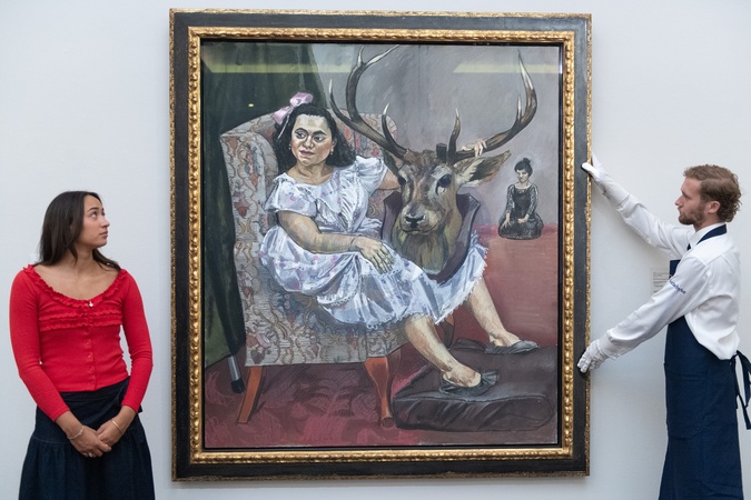 Staff members view 'Snow White Playing with her Father's Trophies' by Paula Rego (£800k - £1.2m) which is going on public view ahead of auctions on 16th - 17th October as part of Sotheby's Frieze Week Auctions - Sotheby's, London, England, UK on Friday 10 October, 2025., Credit:Justin Ng / Avalon