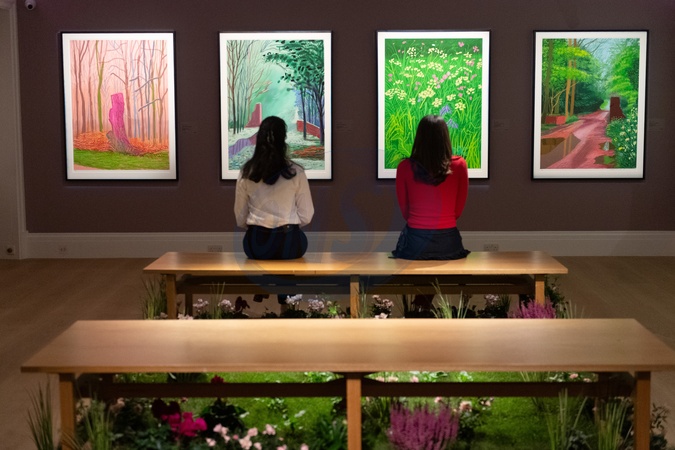 Staff members view 'The Art of Spring' by David Hockney which is going on public view ahead of auctions on 16th - 17th October as part of Sotheby's Frieze Week Auctions - Sotheby's, London, England, UK on Friday 10 October, 2025., Credit:Justin Ng / Avalon