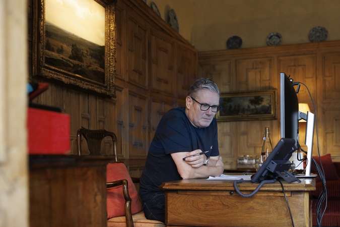 10/10/2025. Ellesborough, United Kingdom. Prime Minister Keir Starmer speaks with German Chancellor Friedrich Merz and French President Emmanuel Macron during an E3 Leaders call from his office in Chequers., Credit:Lauren Hurley / Avalon