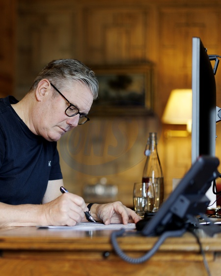 10/10/2025. Ellesborough, United Kingdom. Prime Minister Keir Starmer speaks with German Chancellor Friedrich Merz and French President Emmanuel Macron during an E3 Leaders call from his office in Chequers., Credit:Lauren Hurley / Avalon