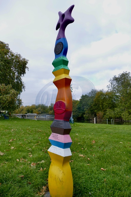 A River Thames Thames Path marker sign painted in rainbow colours to represent Pride which is held in the meadow nearby in the summer months., Credit:Geoffrey Swaine / Avalon